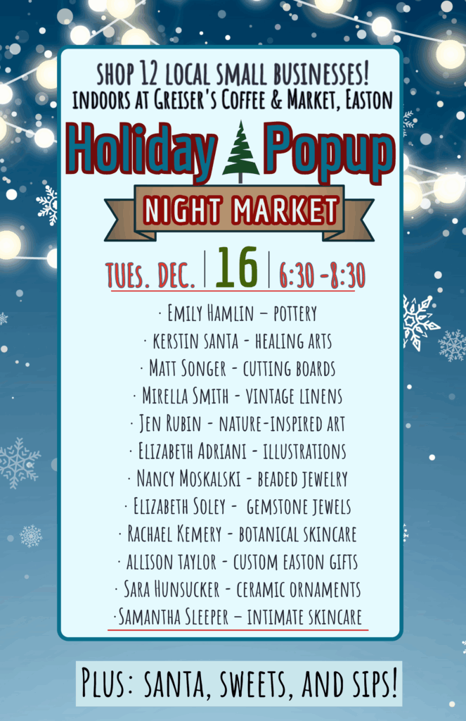 Shopping local on the Saturday after Thanksgiving has become tradition at Greiser’s. Whether you’re coming to town to choose your Christmas tree or bringing your holiday visitors to Greiser’s for hot chocolate, plan some time to stop and stroll the stalls of more than a dozen artisans who produce their work in Easton and nearby.